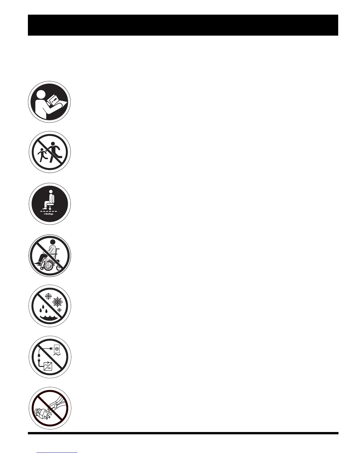 The symbols below are used on the power chair to identify warnings, mandatory actions, and prohibited actions.