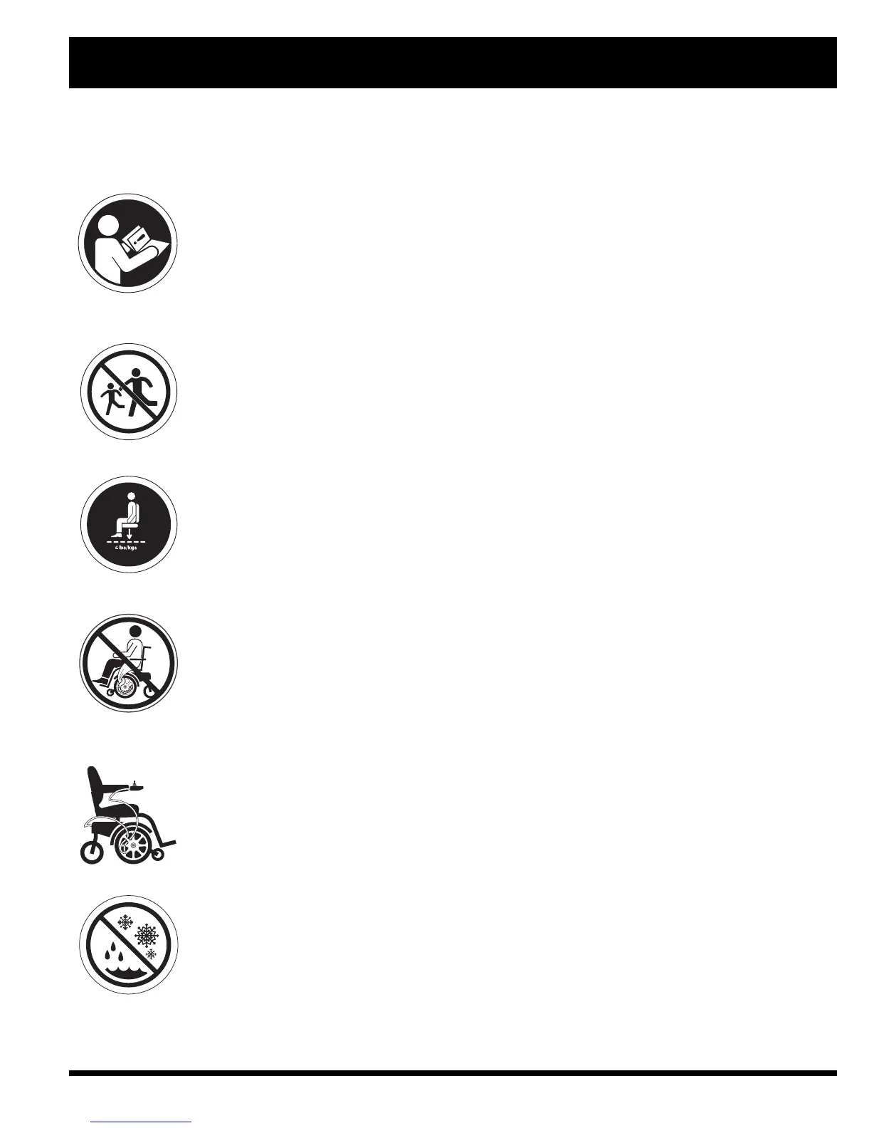 The symbols below are used on the power chair to identify warnings, mandatory actions, and prohibited actions.