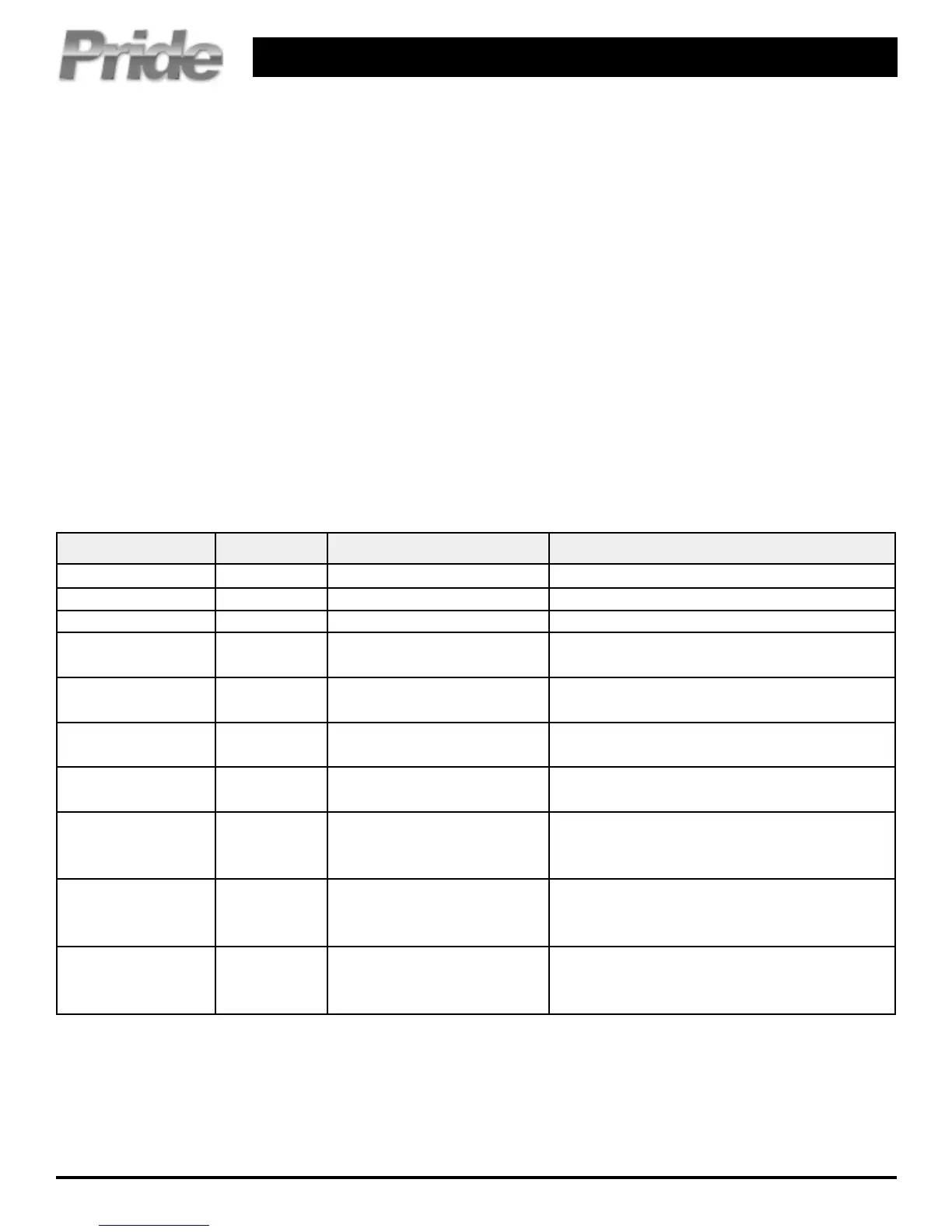 Three red LEDs 7 Joystick error Contact your authorized Pride Provider.
