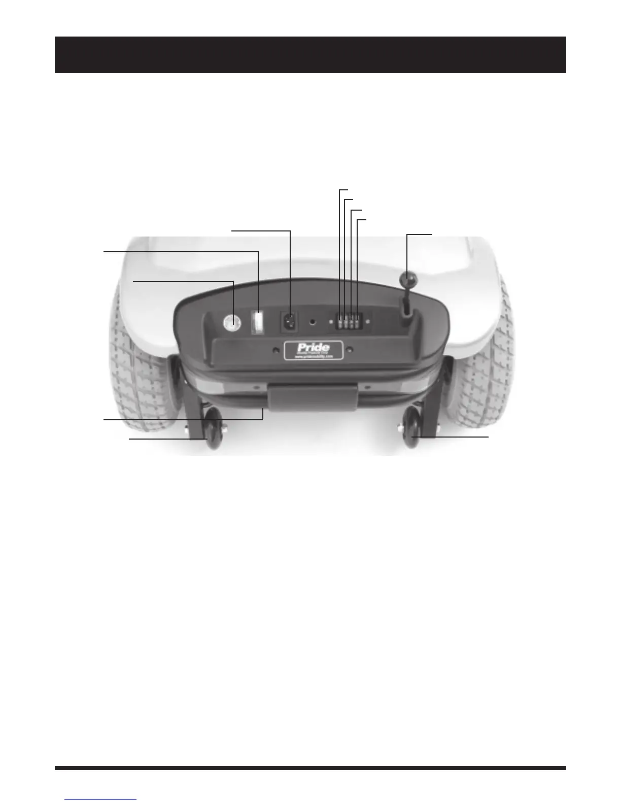 circuit breaker reset button, the ammeter, the manual freewheel lever, the anti-tip wheels, and the motor/transaxle