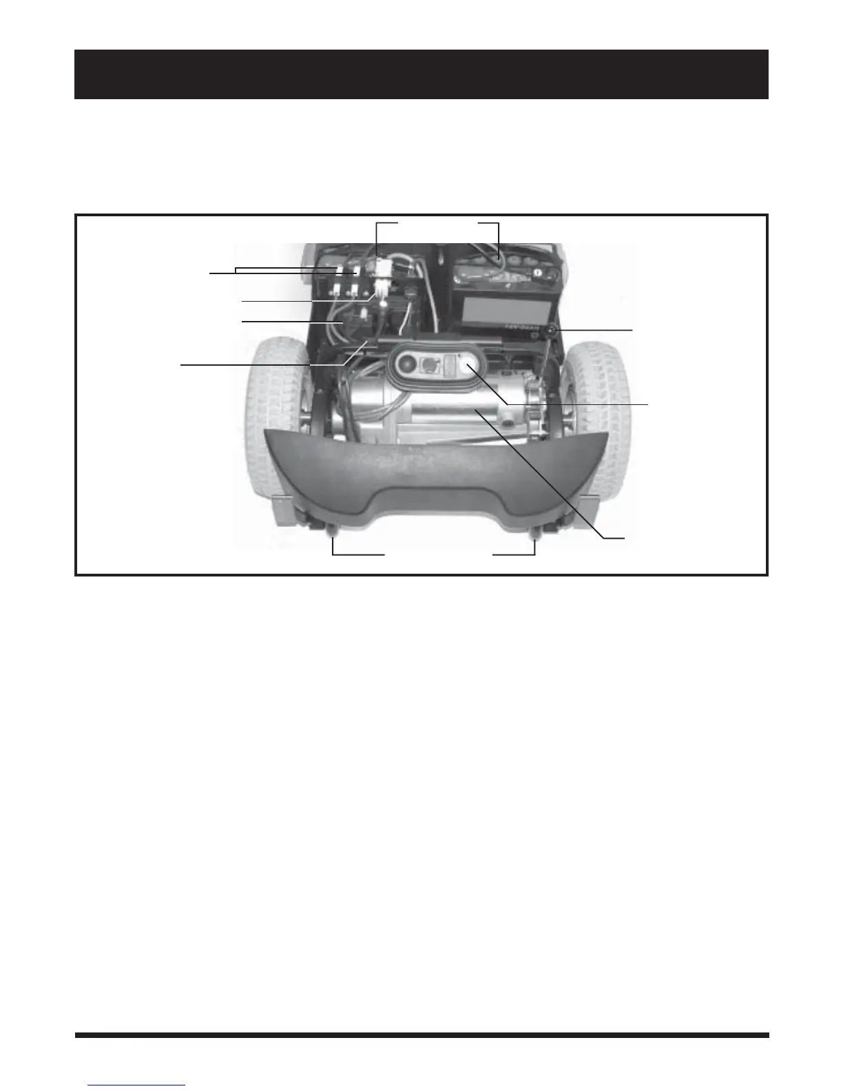 The batteries, electronic controller module, motor/transaxle assembly, manual freewheel lever, the anti-tip