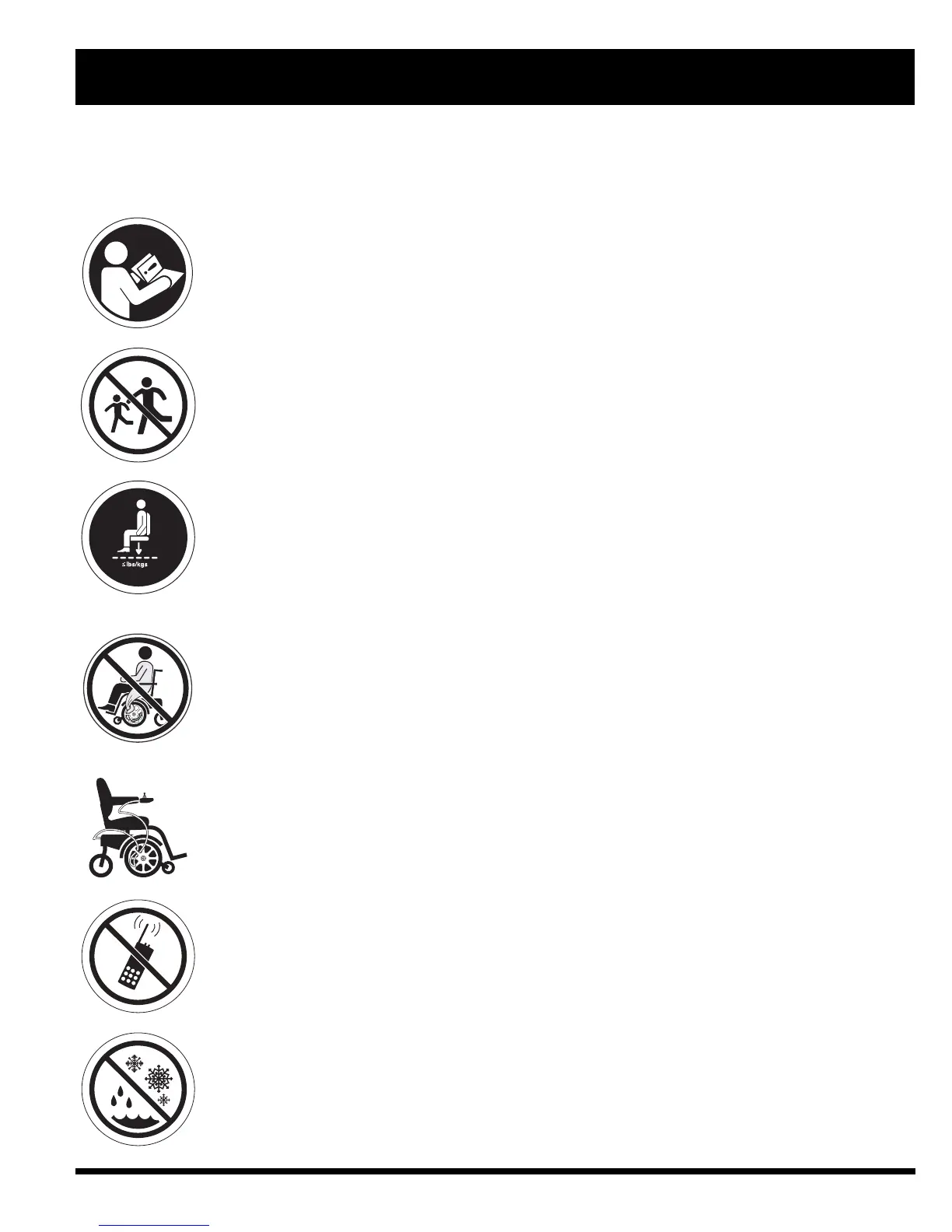 The symbols below are used on the power chair to identify warnings, mandatory actions, and prohibited actions.