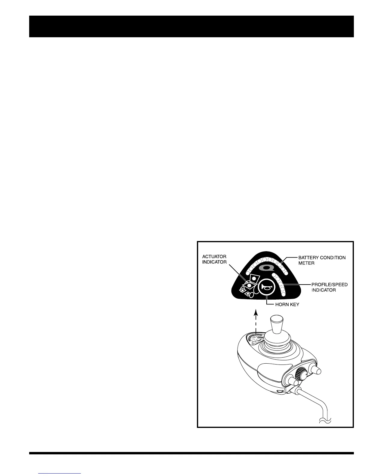 The display pad is located directly in front of the joystick. It contains the horn key, battery condition meter, profile /speed