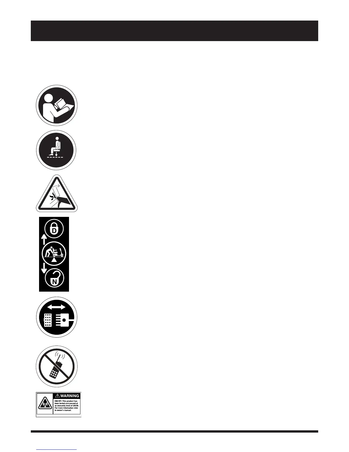 The symbols below are used on the scooter to identify warnings, mandatory actions, and prohibited actions. It is