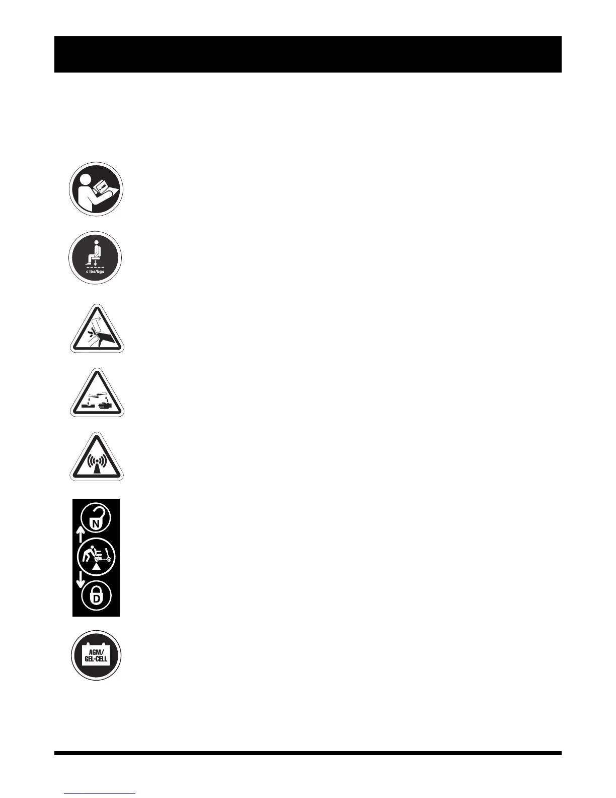 The symbols below are used on the Travel Scooter to identify warnings, mandatory actions, and prohibited