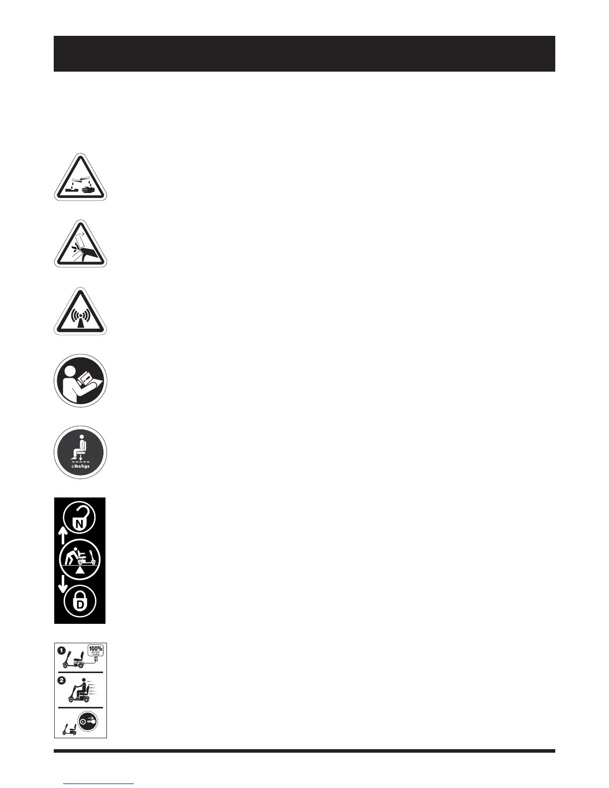 The symbols below are used on the Travel Scooter to identify warnings, mandatory actions, and prohibited ac-