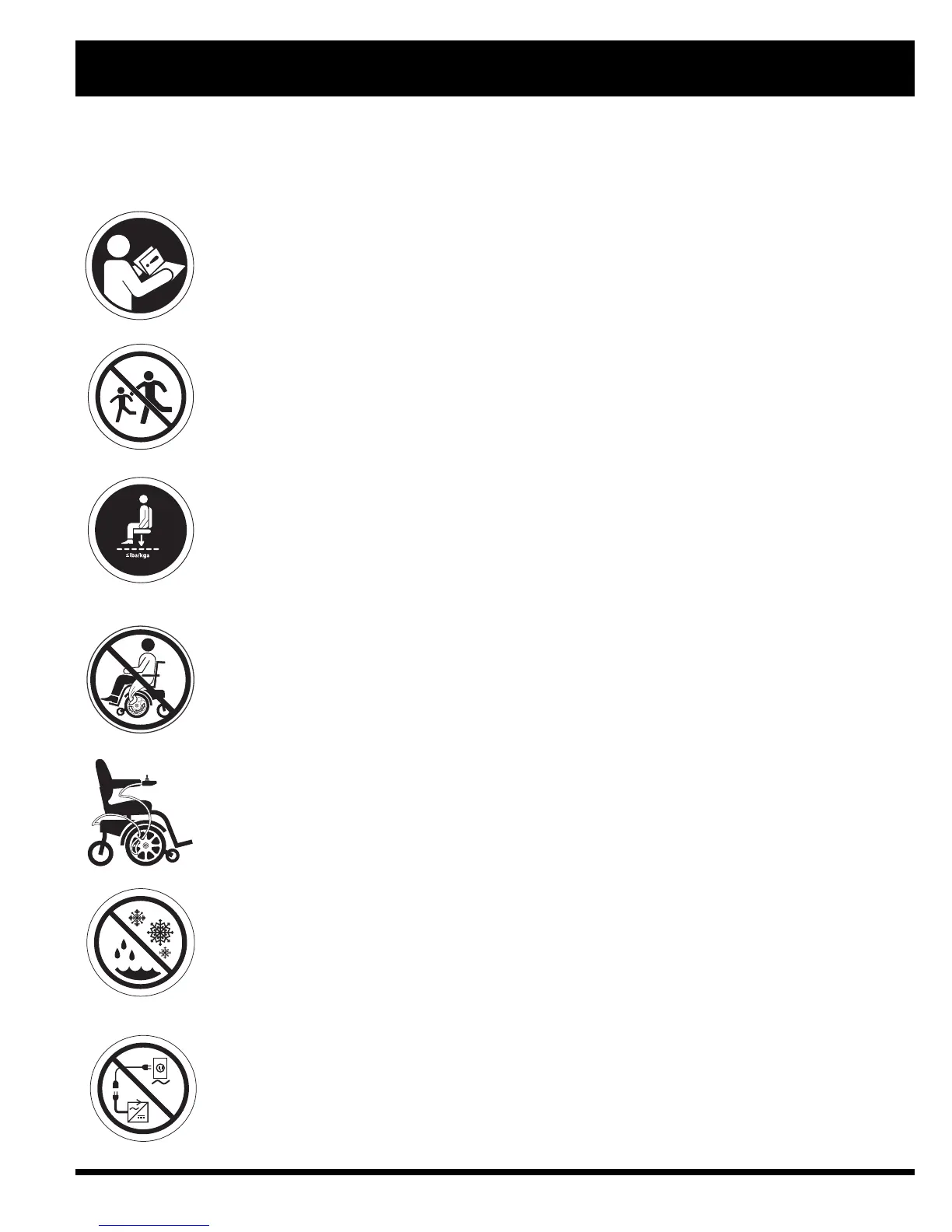 The symbols below are used on the power chair to identify warnings, mandatory actions, and prohibited actions.