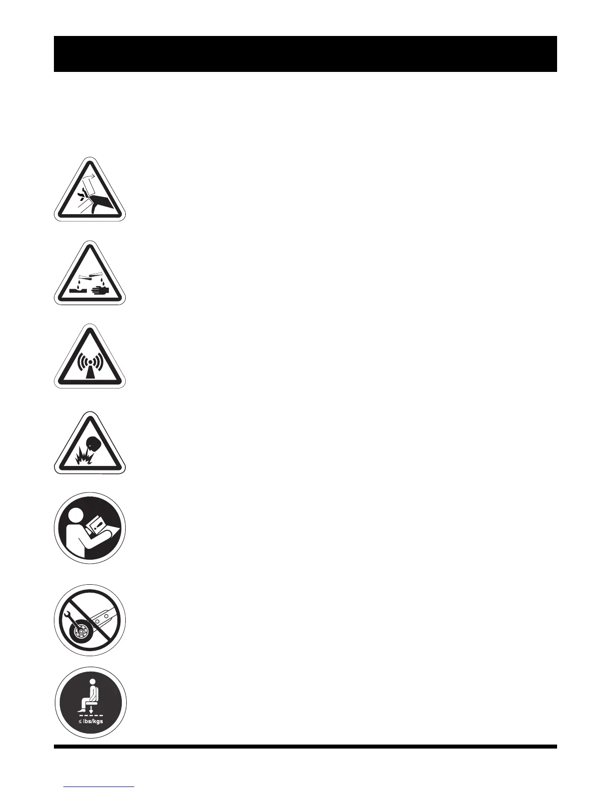 The symbols below are used on the scooter to identify warnings, mandatory actions, and prohibited