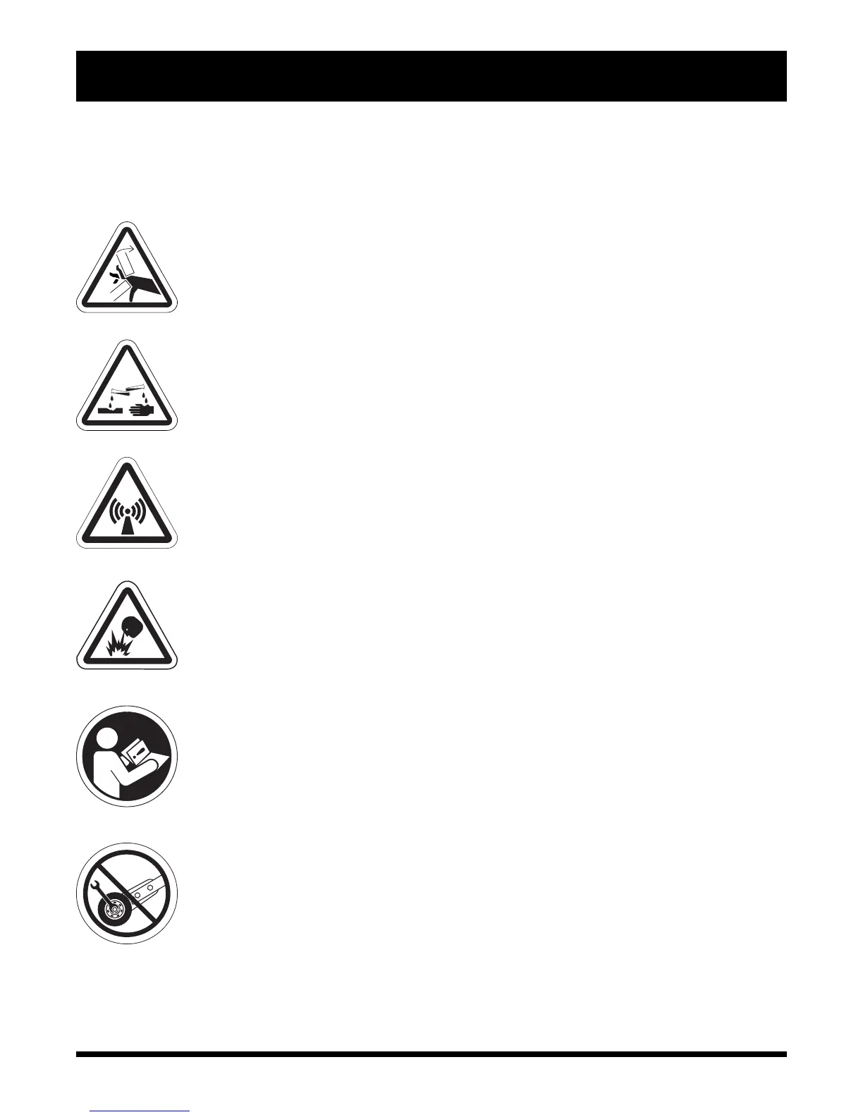 The symbols below are used on the scooter to identify warnings, mandatory actions, and prohibited