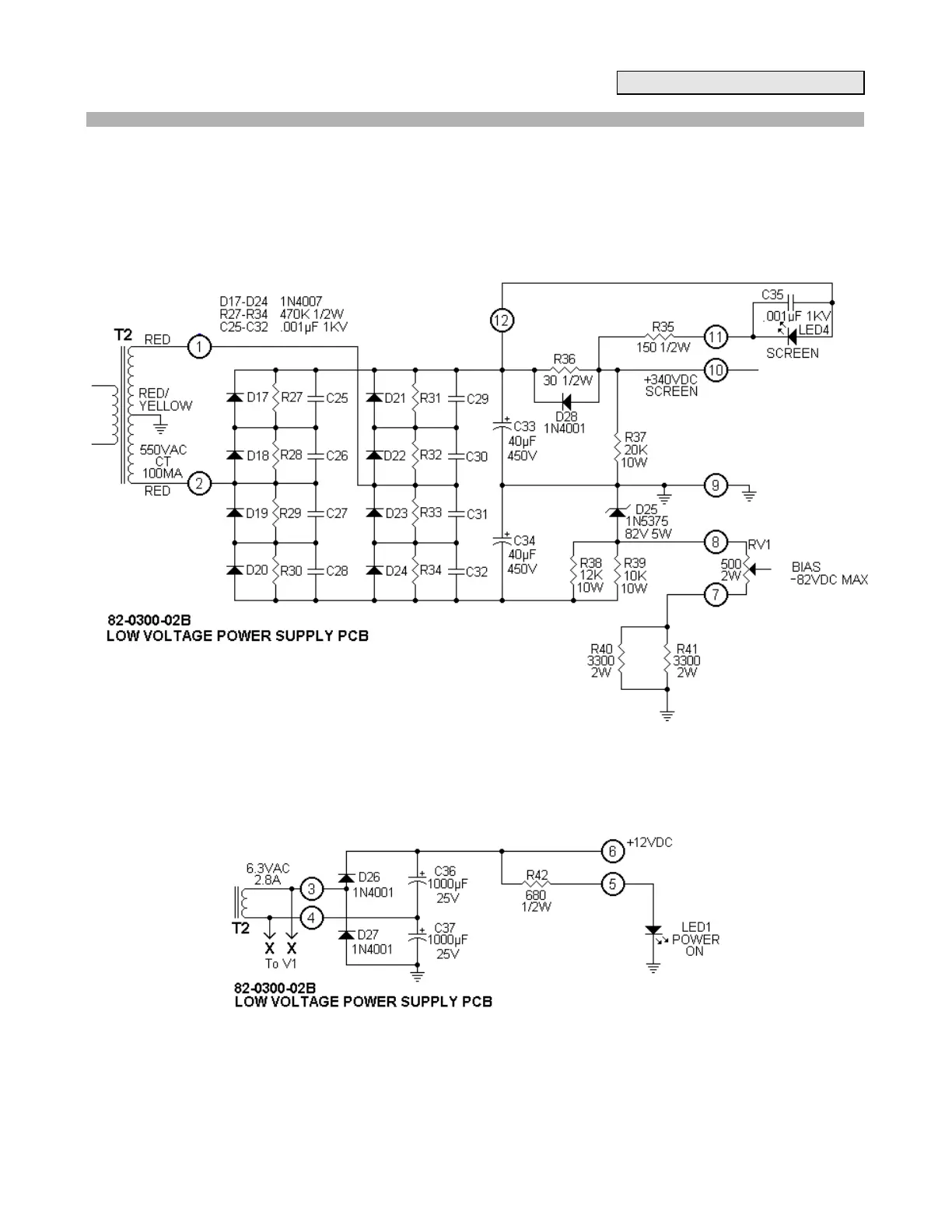 allows a split output voltage. Approximately 700 VDC is developed across the two 40µf filter caps (C33, C34),
