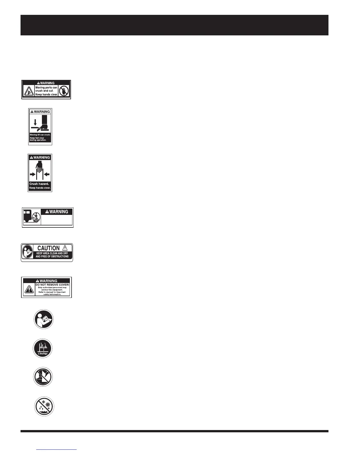 Risque d’écrasement—Pièces mobiles peuvent écraser et couper. Éloignez les mains.
