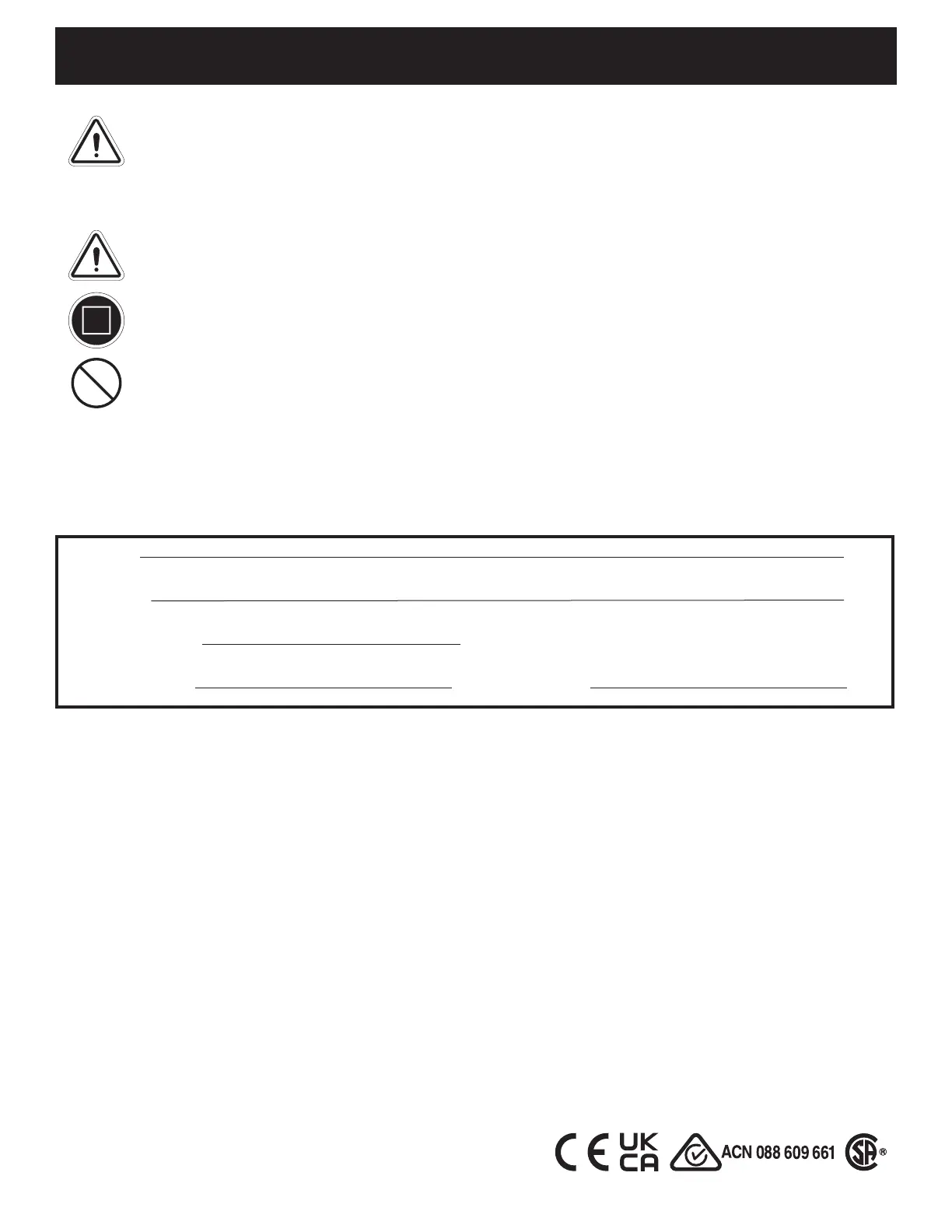 in any circumstances. Performing a prohibited action can cause personal injury and/or equipment