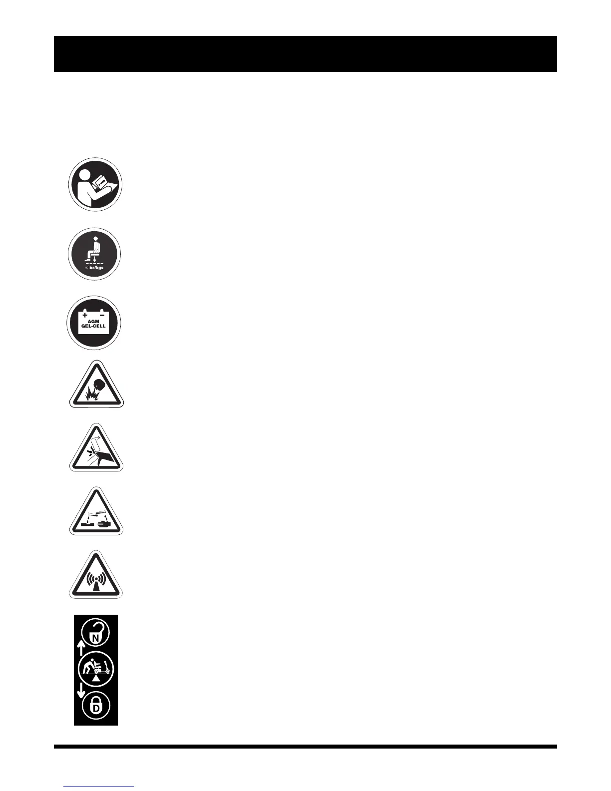 The symbols below are used on the Travel Scooter to identify warnings, mandatory actions, and prohibited