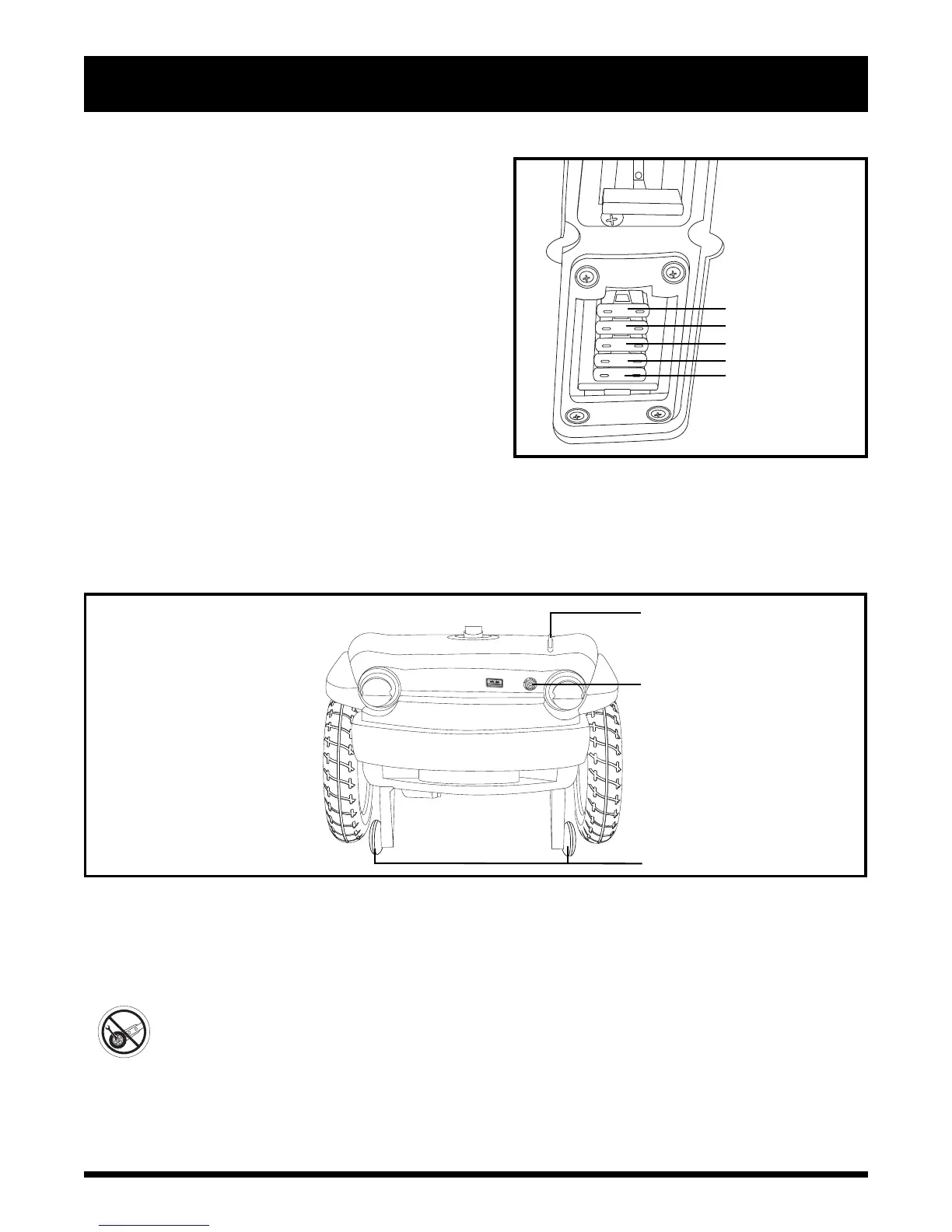 The batteries (not shown), the main circuit breaker (reset button), the manual freewheel lever, the anti-tip