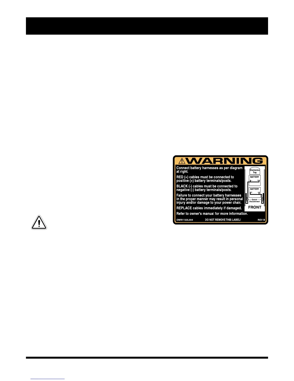the negative (black) terminal. Install the battery in the rear of your power chair’s battery tray with the battery’s