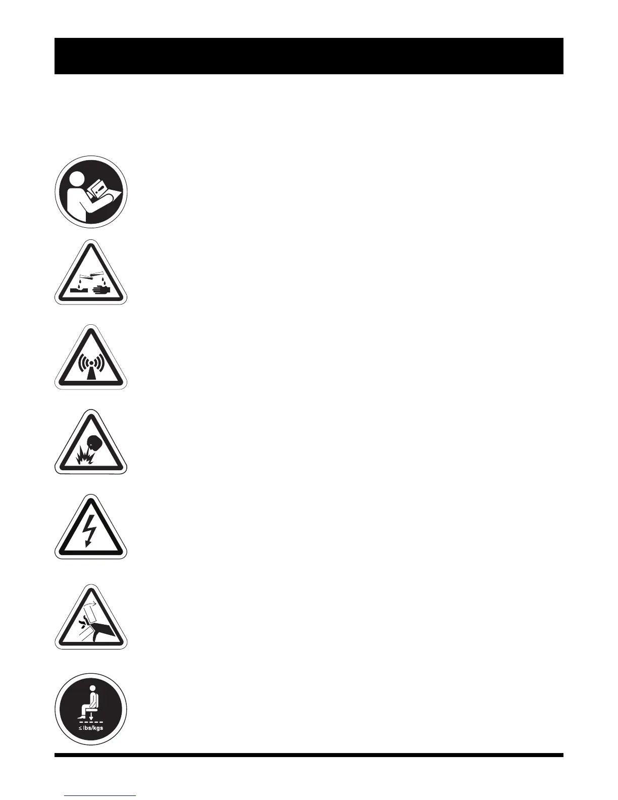 The symbols below are used on the scooter to identify warnings, mandatory actions, and prohibited
