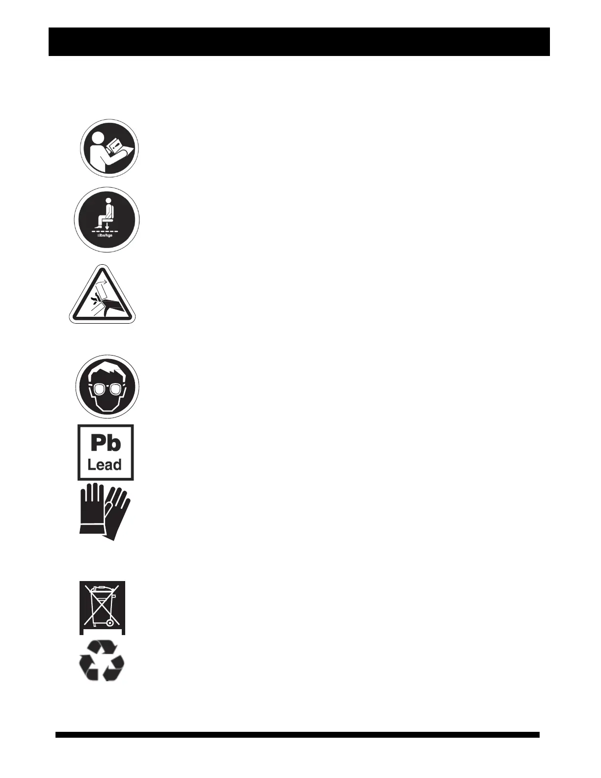 The symbols below are used on the lift system to identify warnings and mandatory or prohibited