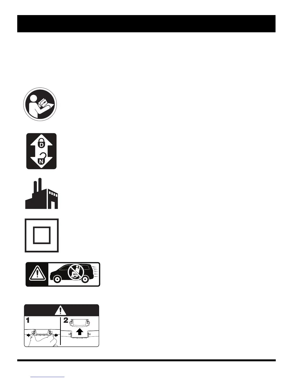 The symbols below are used on the power chair to identify warnings, mandatory actions, and prohibited actions.