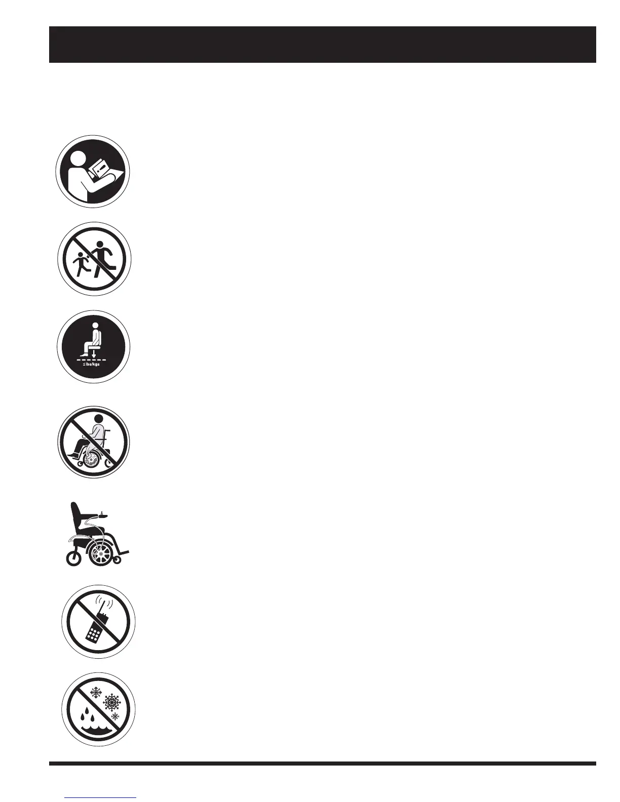The symbols below are used on the power chair to identify warnings, mandatory actions and prohibited actions. It is very