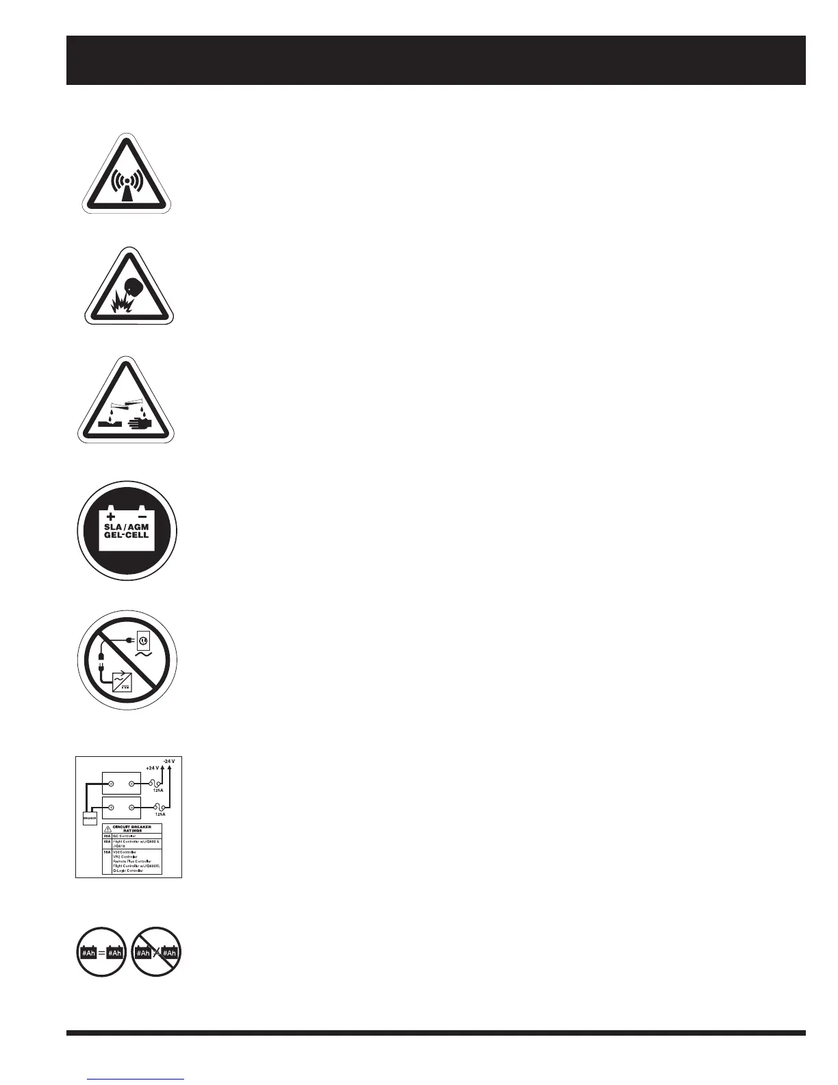 Use only AGM or Gel-Cell batteries to reduce the risk of leakage or explosive conditions.