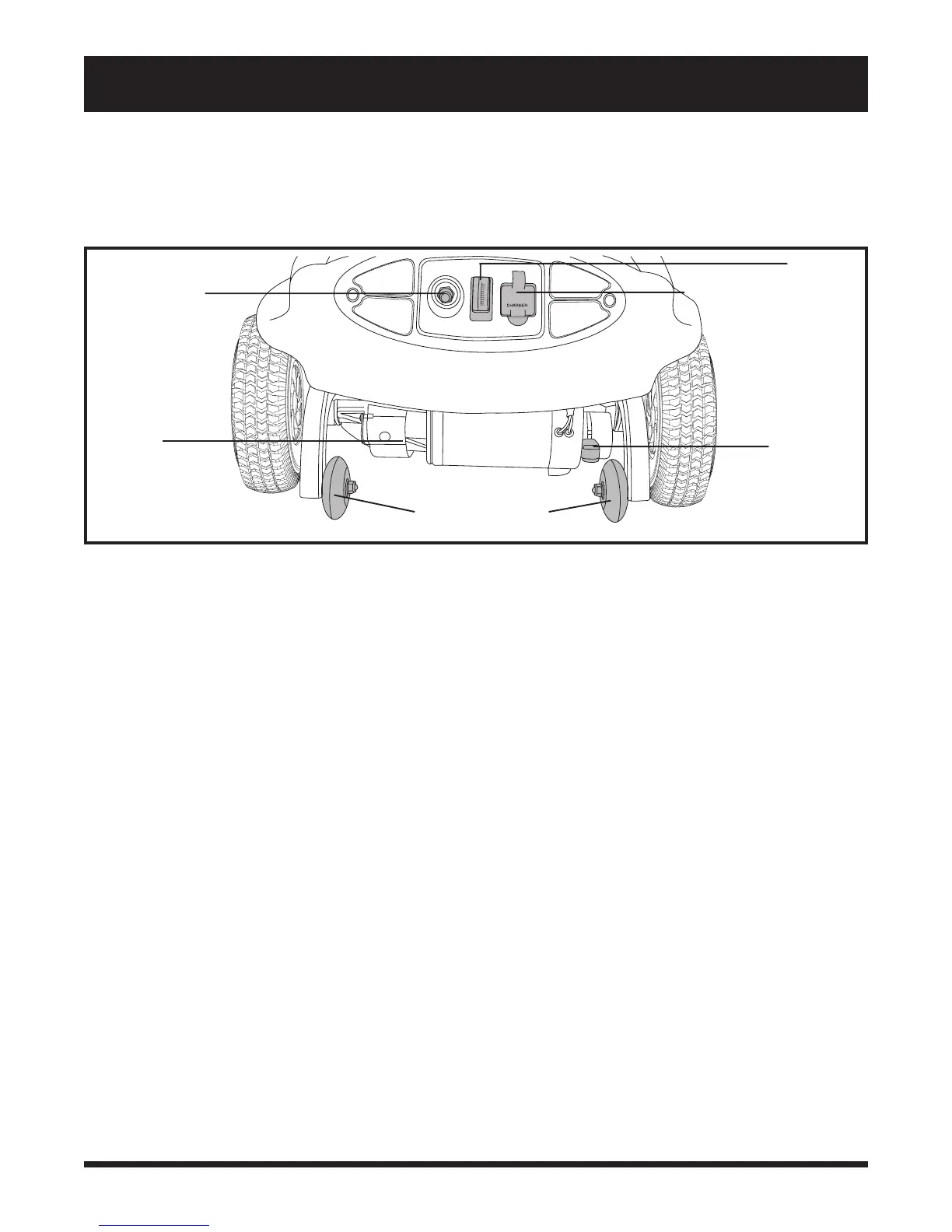 circuit breaker reset button, the ammeter, the manual freewheel lever, the anti-tip wheels, and the motor/transaxle