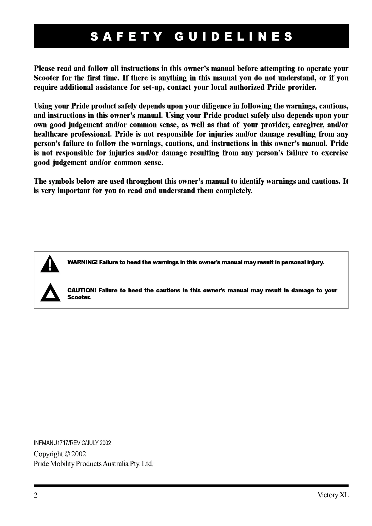 Using your Pride product safely depends upon your diligence in following the warnings, cautions,