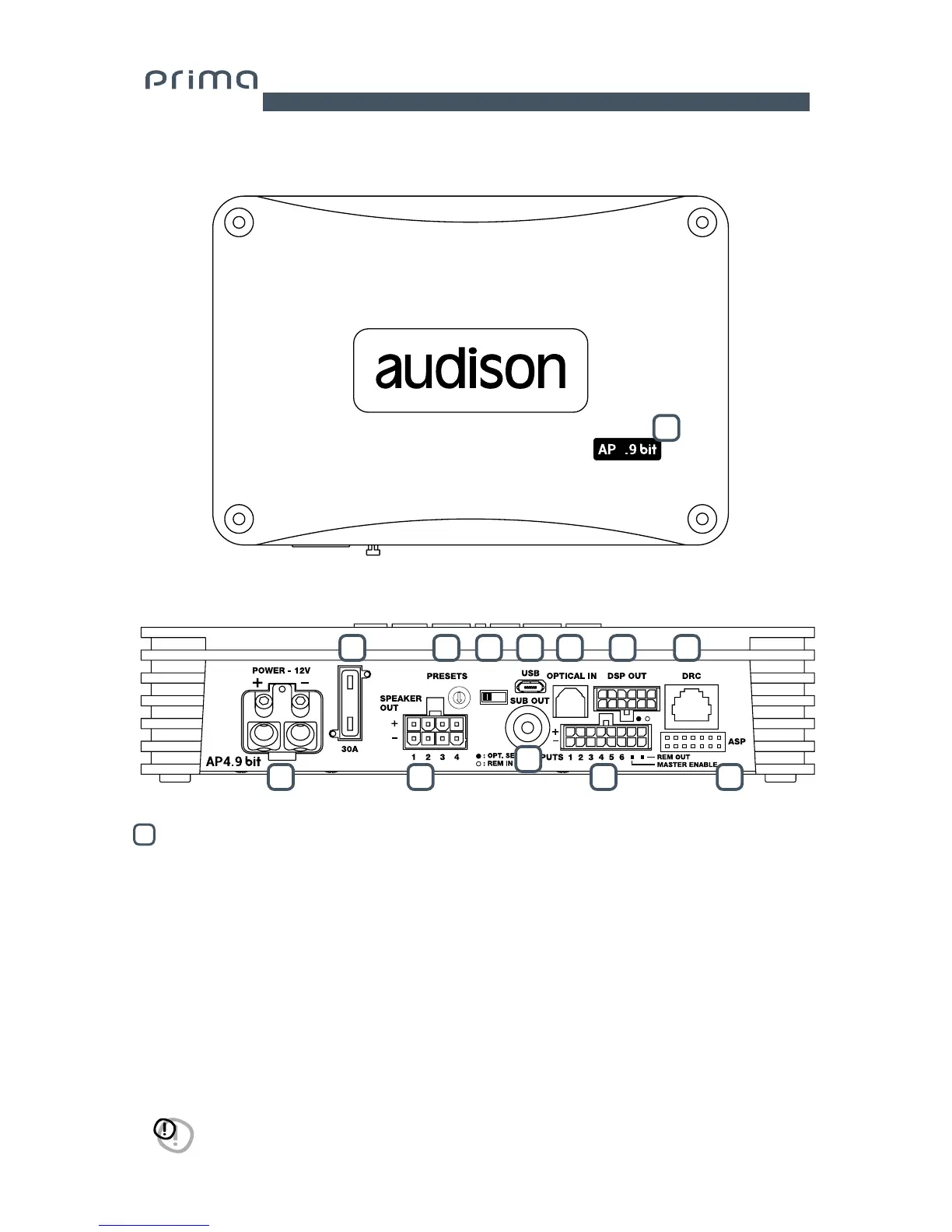 + Power (11-15 VDC): connection terminal for AP4.9 bit power supply positive pole. The jack accepts a stripped