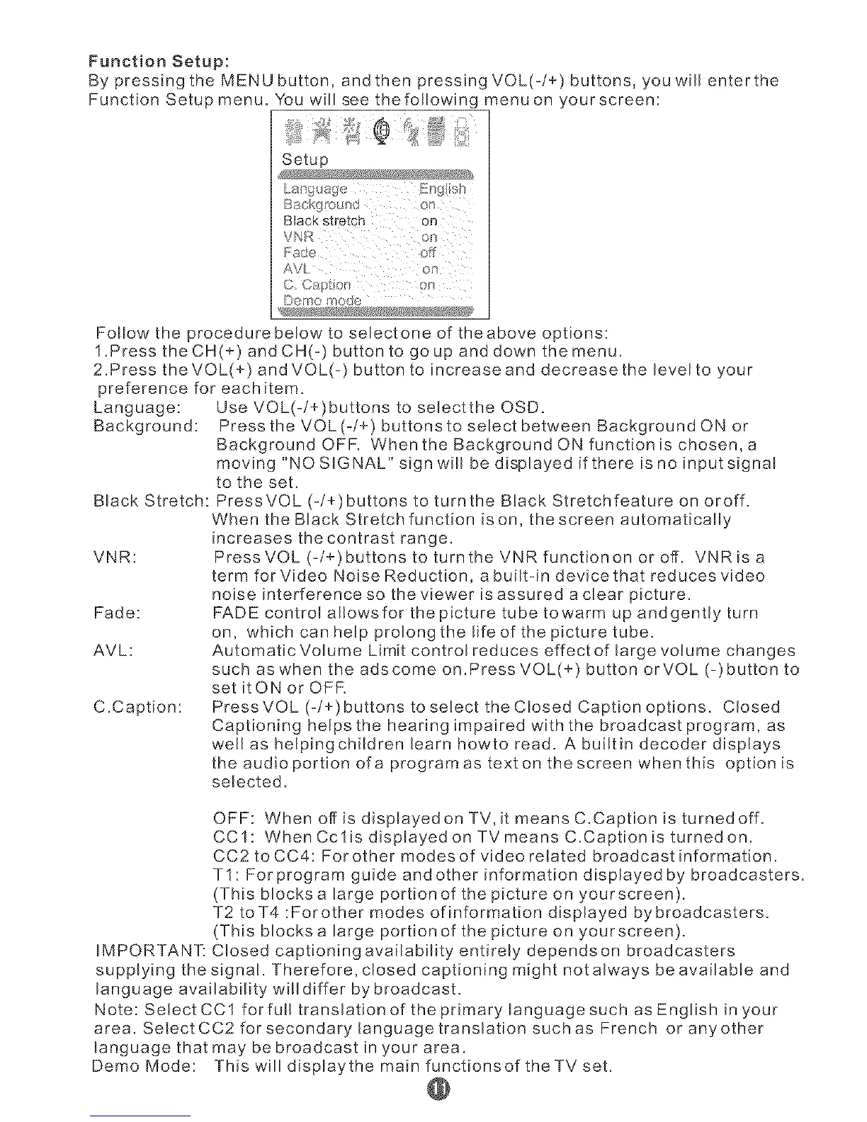 C.Caption: Press VOL (-/+) buttons to select the CIosed Caption options. Closed