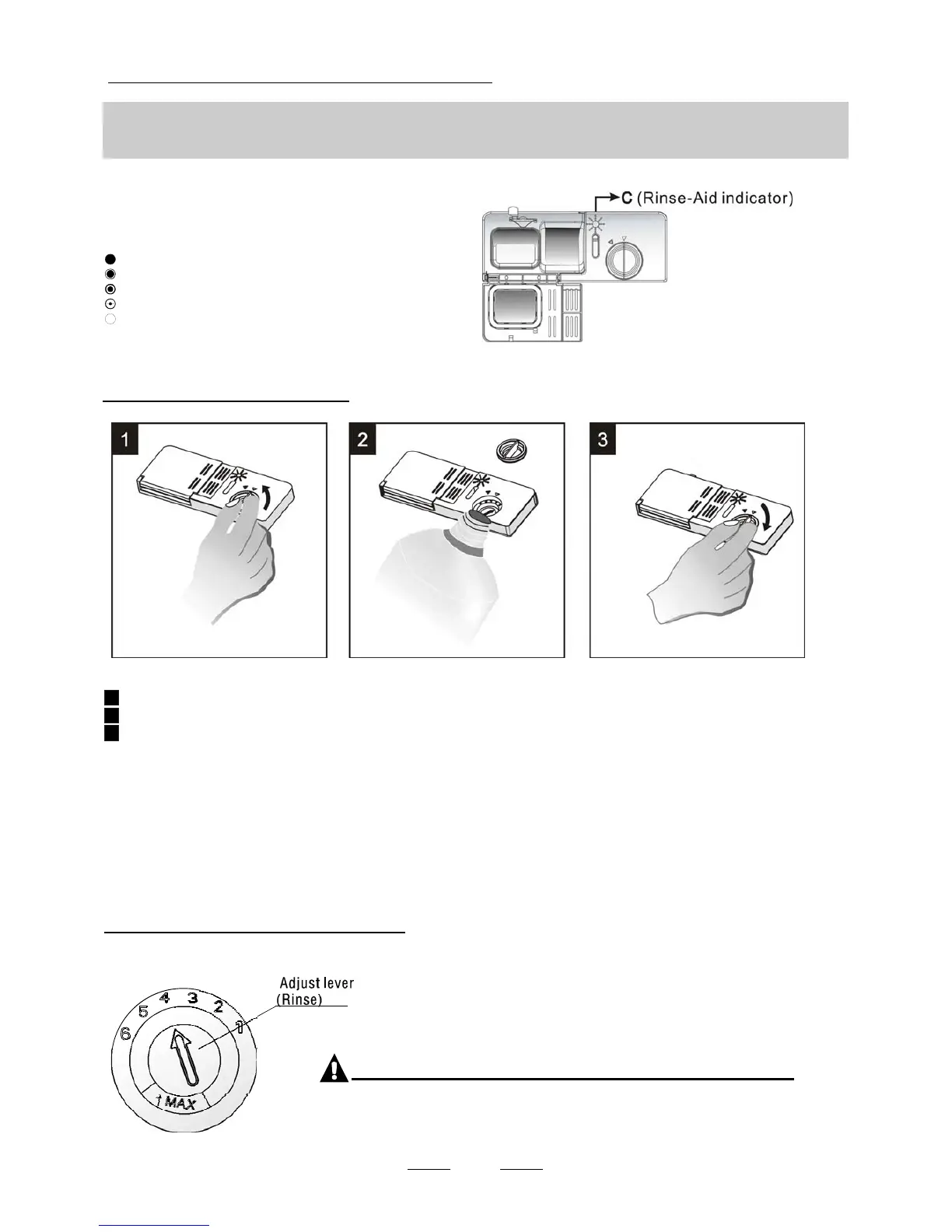 indicator "C" located next to the cap. When the rinse-aid container is full, the whole indicator will be dark .As the rinse-aid