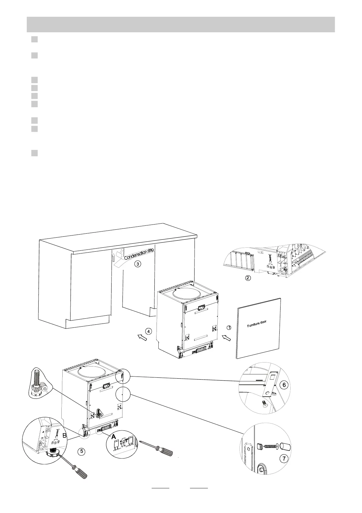 the front feet, use a flat screw driver and turn the front feet until the dishwasher is level (Illustration 5B).