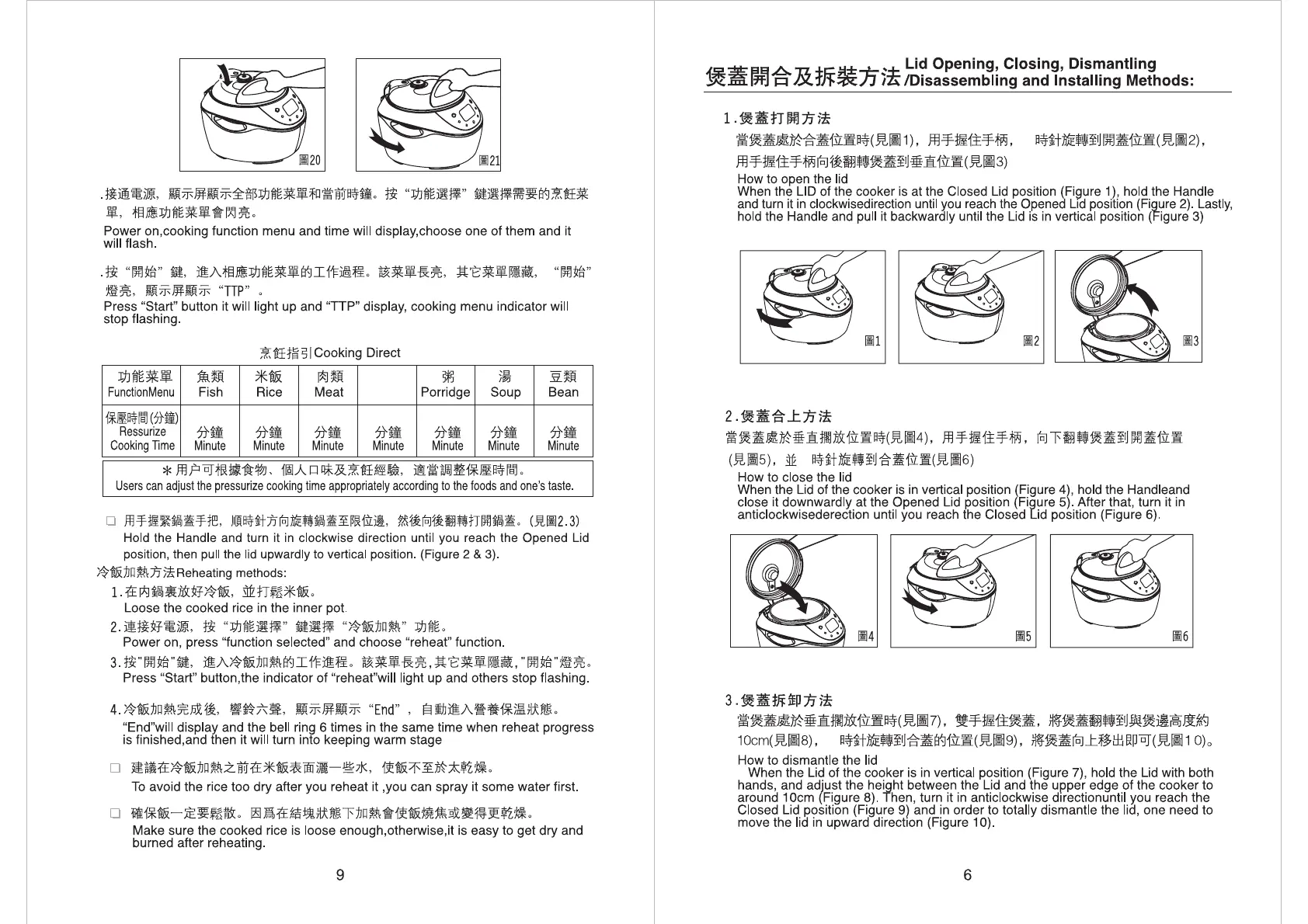 Primada PC-5610 - Power On, Cooking Function Menu and Time will Display; Lid Opening, Closing, Dismantling; How to Open the Lid; How to Close the Lid