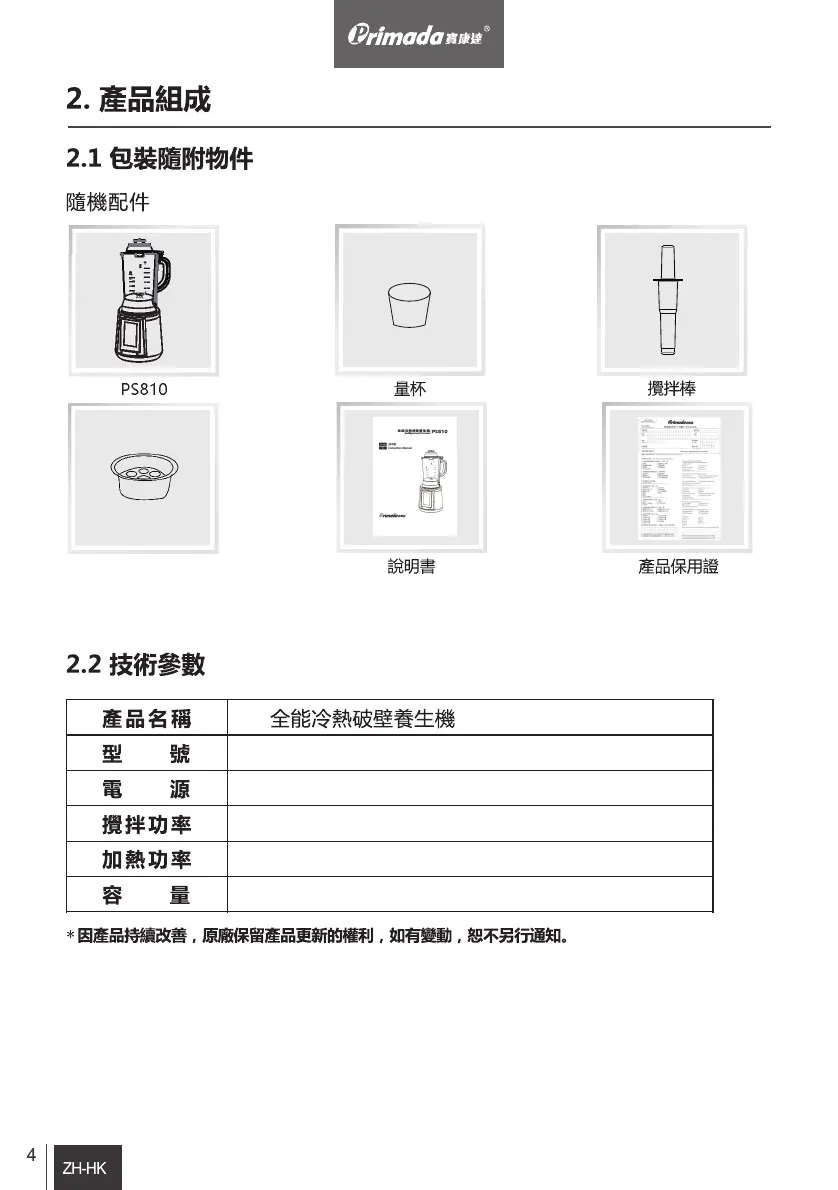 Primada PS810 - 產品組成; 包裝隨附物件; 技術參數