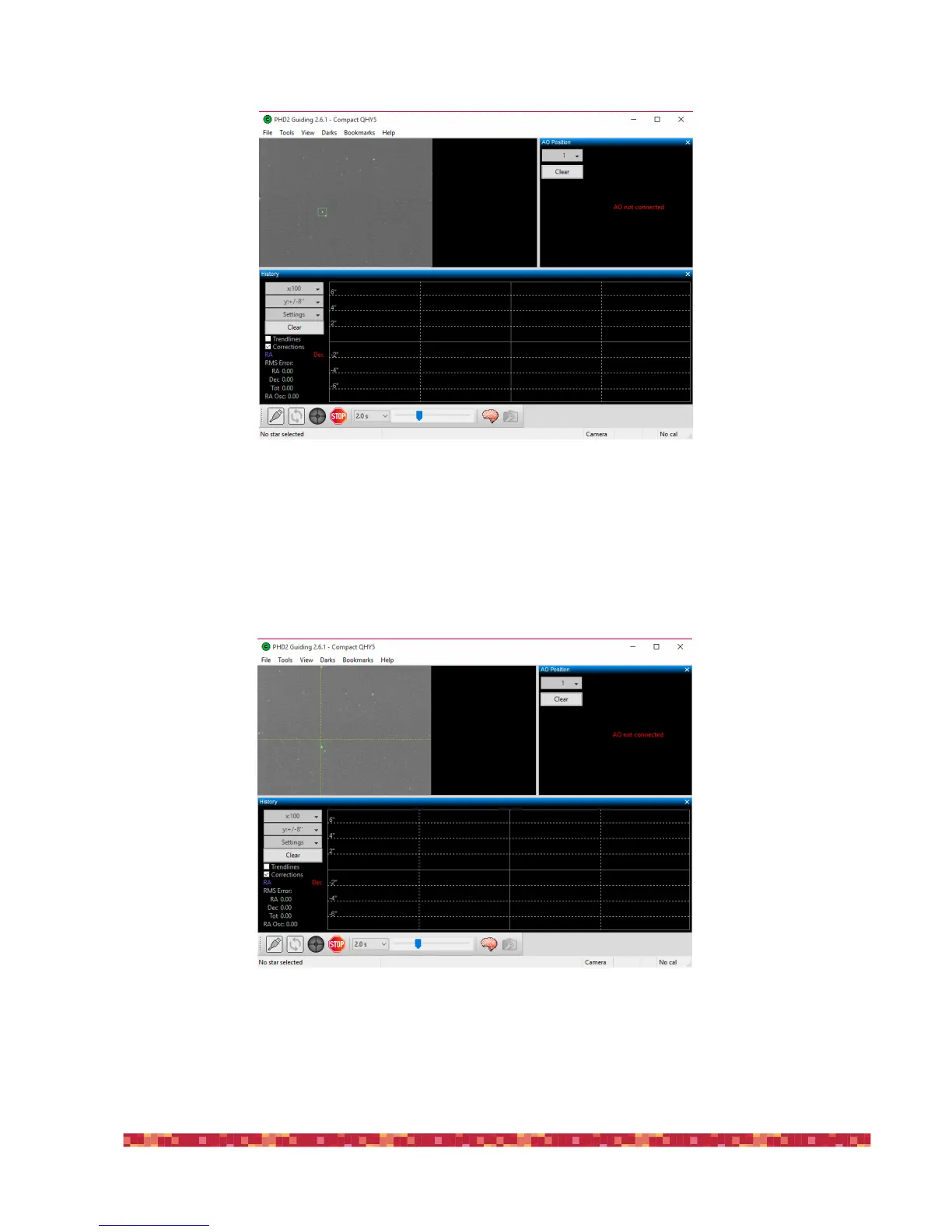 7) Then press the third button on the left (the one with the green icon): PHD2 Guiding will automatically start the calibration process