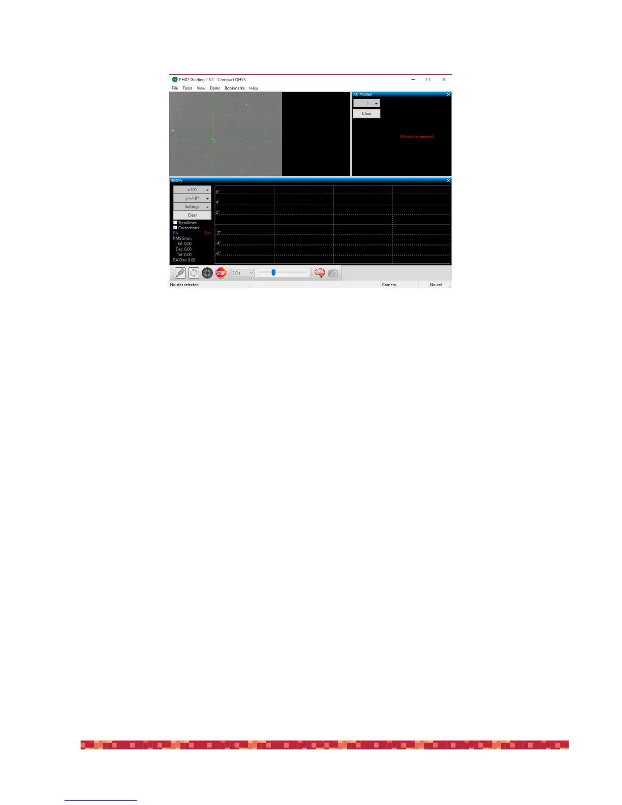 8) After the calibration, PHD2 Guiding will indicate the starting position of the guide star with two green lines (one horizontal and one