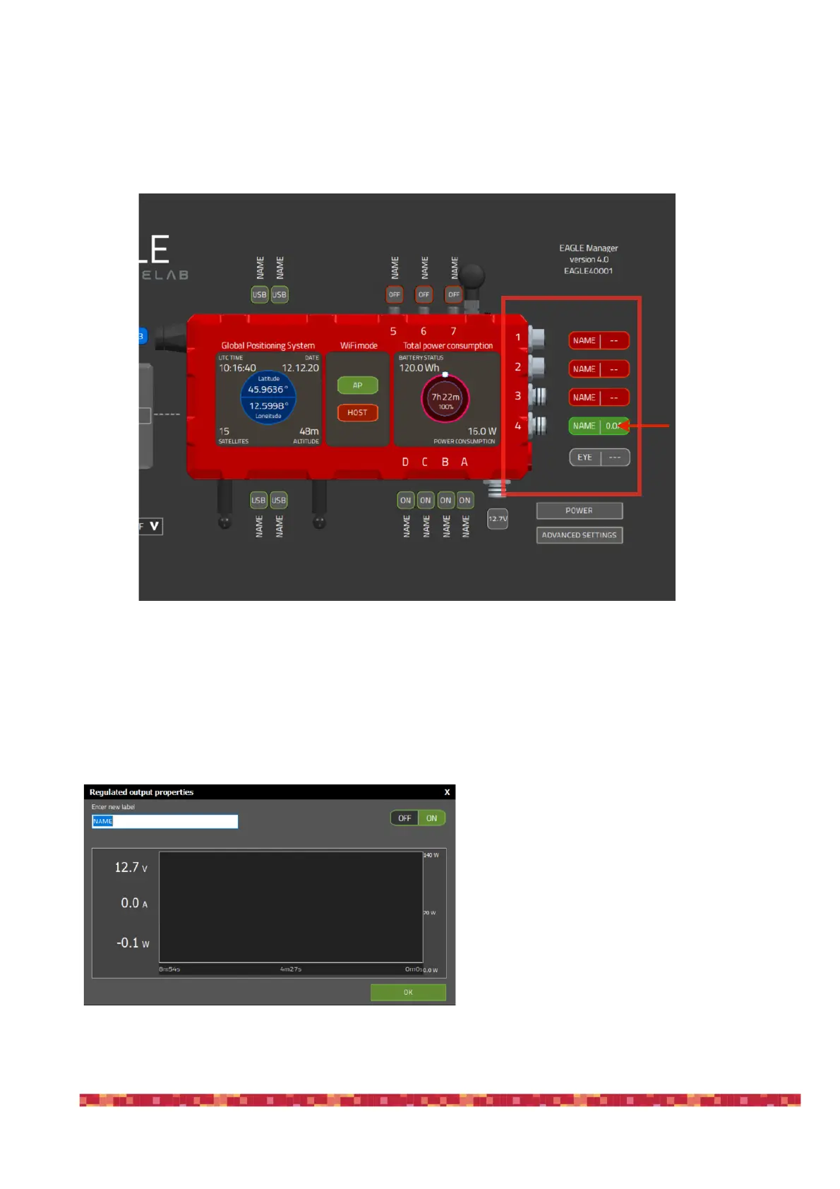 the 12V power out ports to activate it, the port will become green and it will power the connected device. Click with the