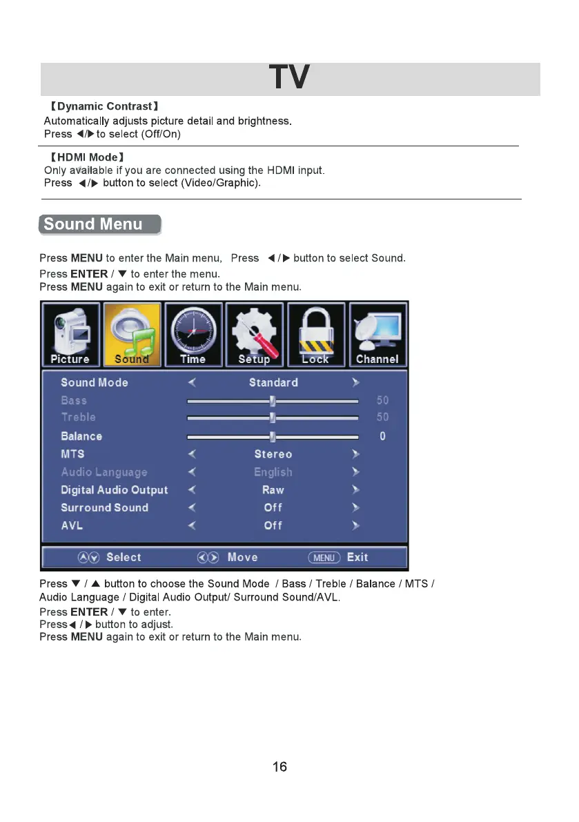 PrimeCables Cab-LE32D11 - Sound Menu Settings; Sound Mode Selection; Bass, Treble, and Balance