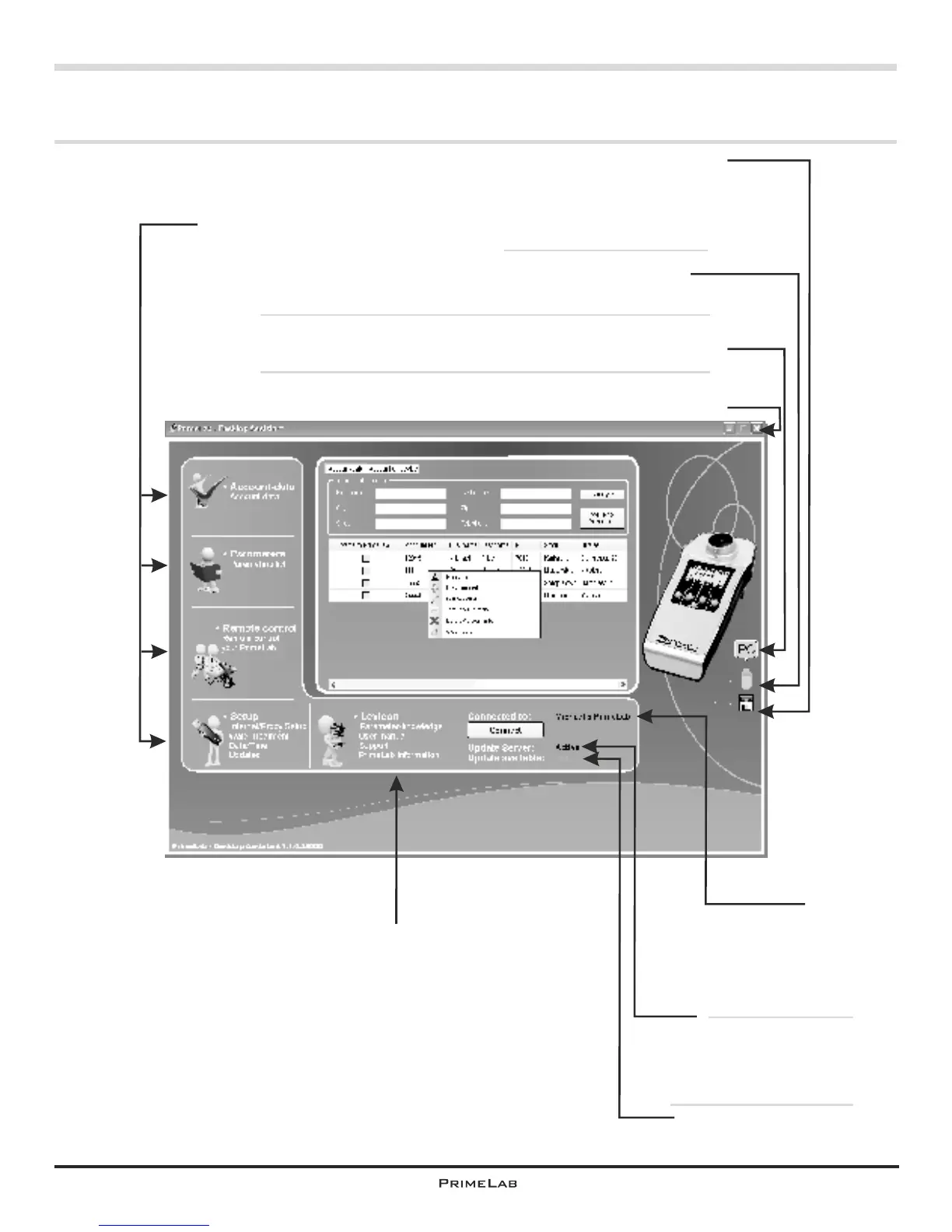 “Green” means: PrimeLab and PC connected via Bluetooth .