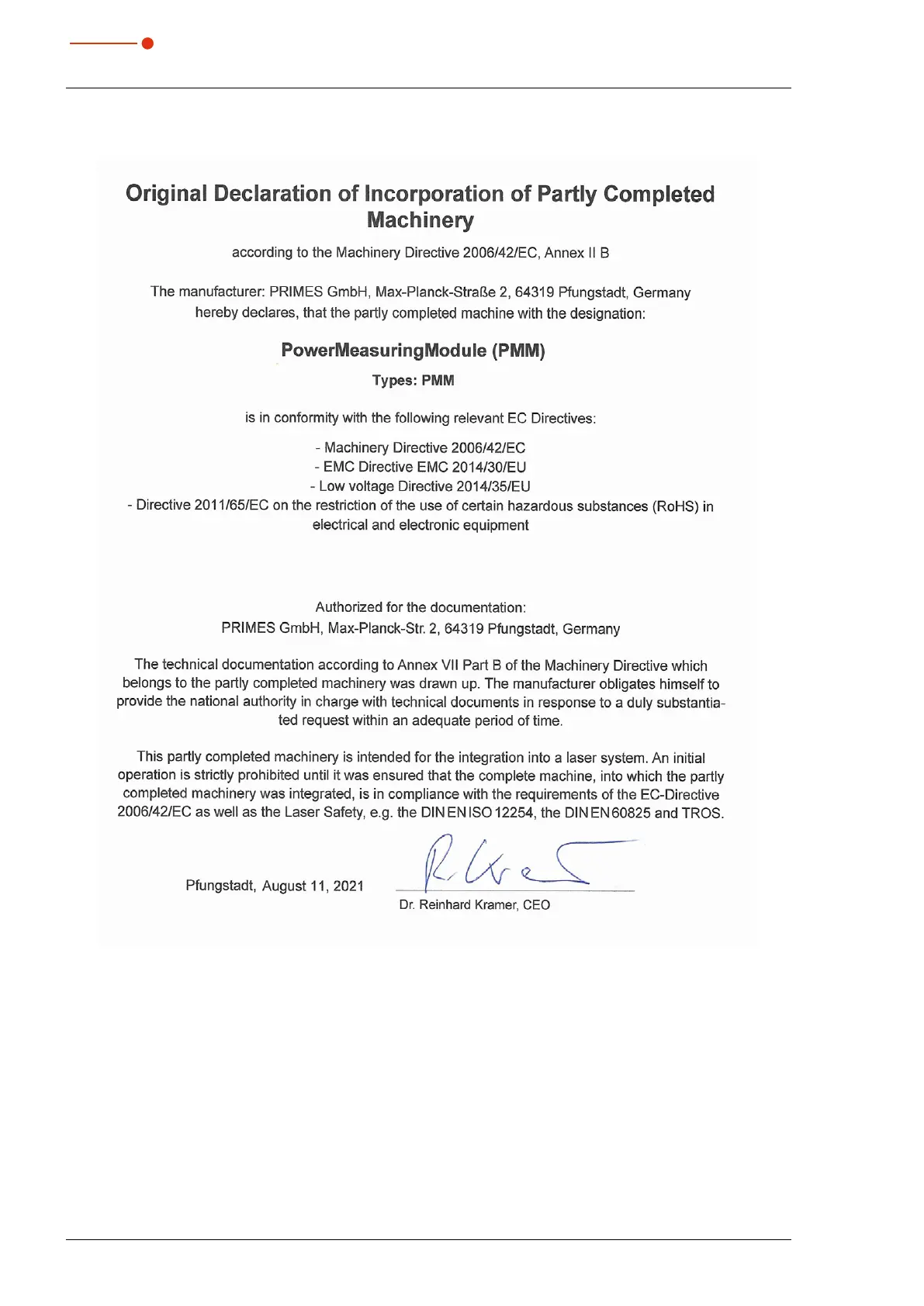Primes PROFINET - Declaration of Incorporation of Partly Completed Machinery
