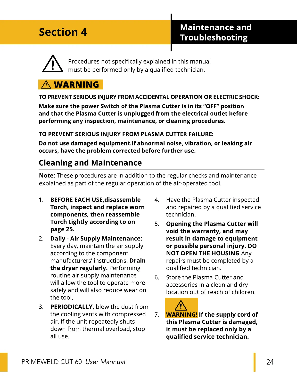 and that the Plasma Cutter is unplugged from the electrical outlet before