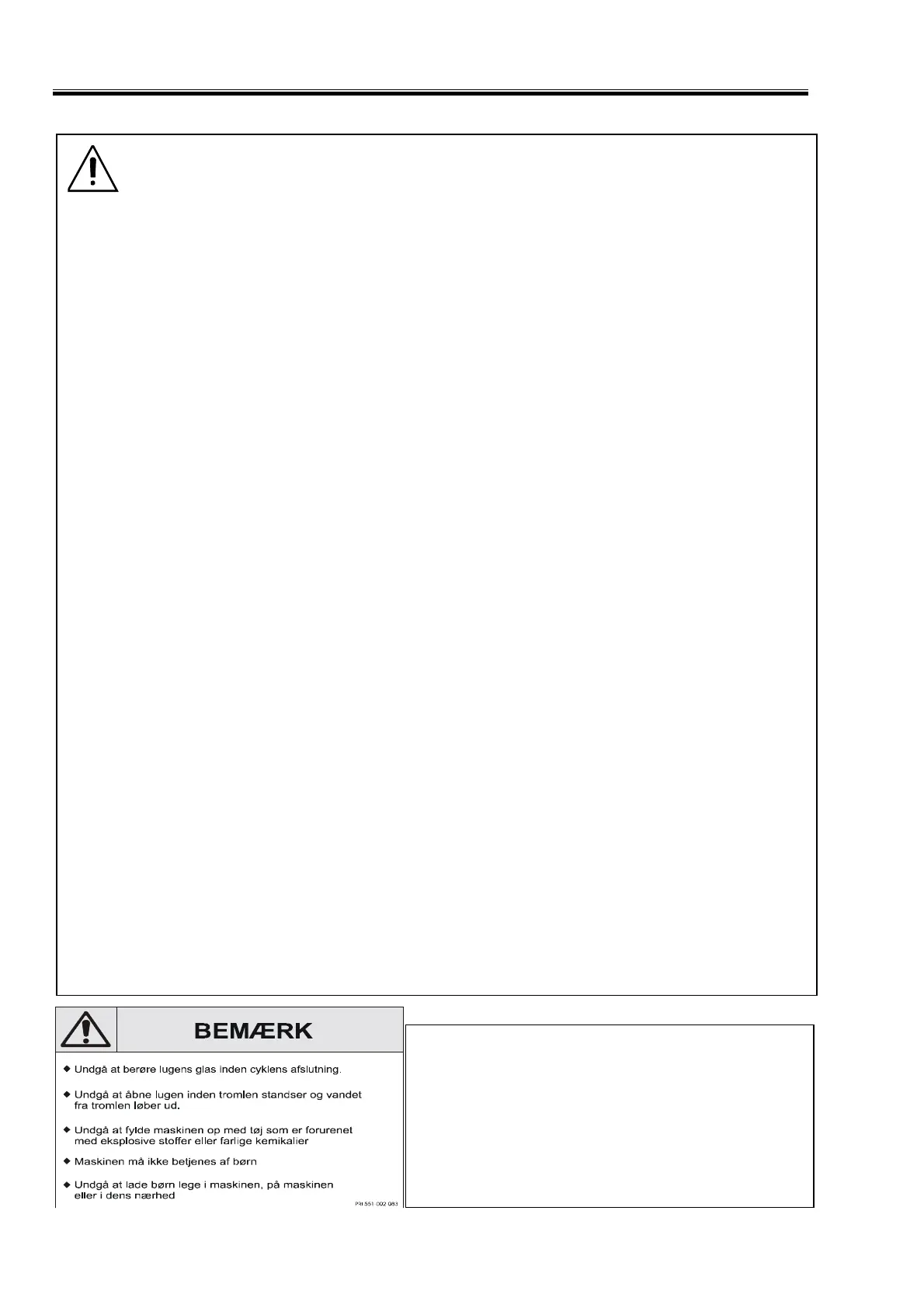 Maskinen er bestemt kun til vask af tekstil. Der forbydes at vaske eller at der er andre ting i vasketromlen,