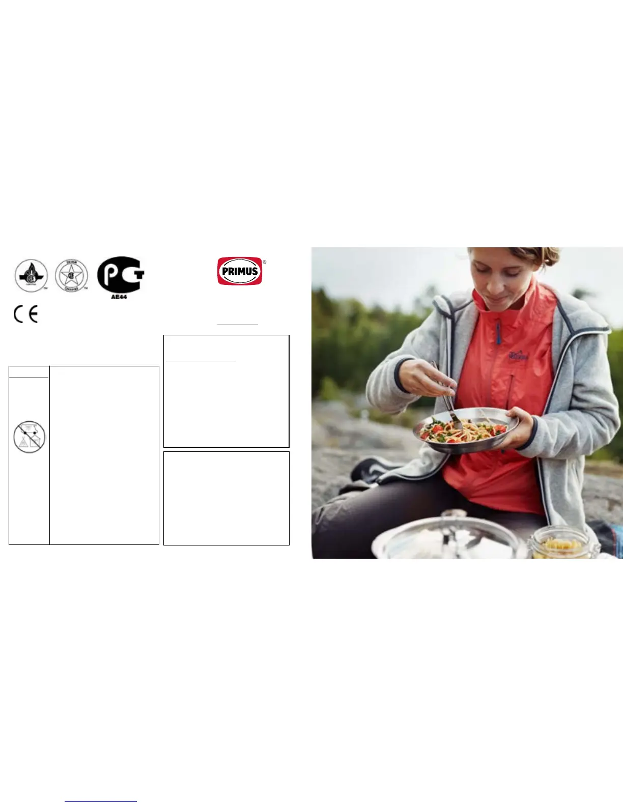 Primus ONJA - Safety Warnings; Carbon Monoxide Hazard; Gas Leak Procedures; Flammable Liquid Storage