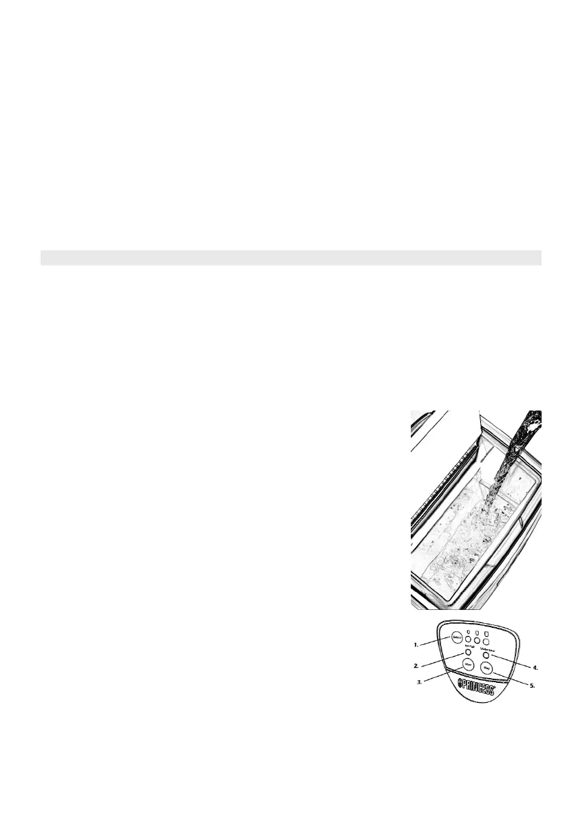 Jos vesi loppuu, ’Water Low’-merkkivalo (4) syttyy. Täytä vesisäiliö vedellä ja paina ’Start’-painiketta