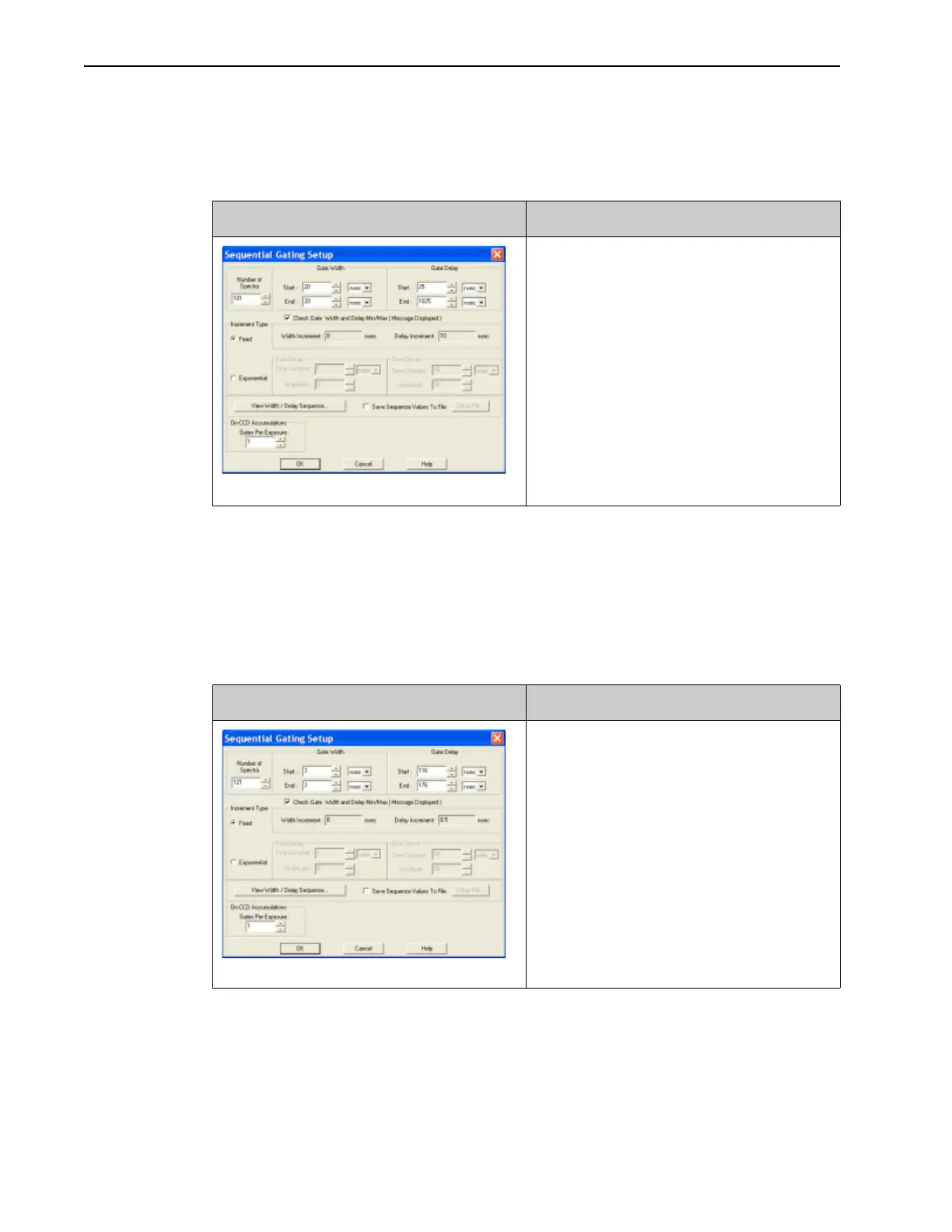 2. Next, set the sequential gating parameters for 20 ns gate width and 101 images/spectra
