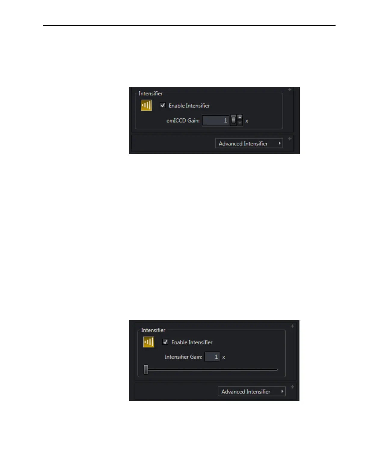 Intensifier Gain values are whole numbers from 1x to 100x, inclusive.