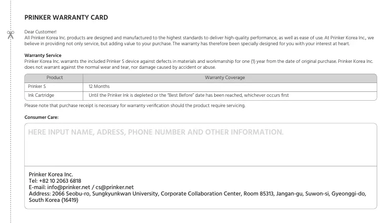 Prinker Korea Inc. warrants the included Prinker S device against defects in materials and workmanship for one (1) year from the date of original purchase. Prinker Korea Inc.