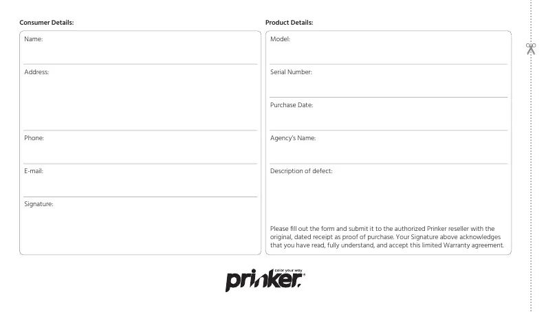 Please fill out the form and submit it to the authorized Prinker reseller with the