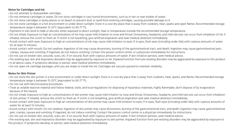 • Do not inhale. Exposure to high air concentrations of ink may cause mild irritation to nose and throat. Drowsiness, headache, and mild narcosis can occur from inhalation of ink. If