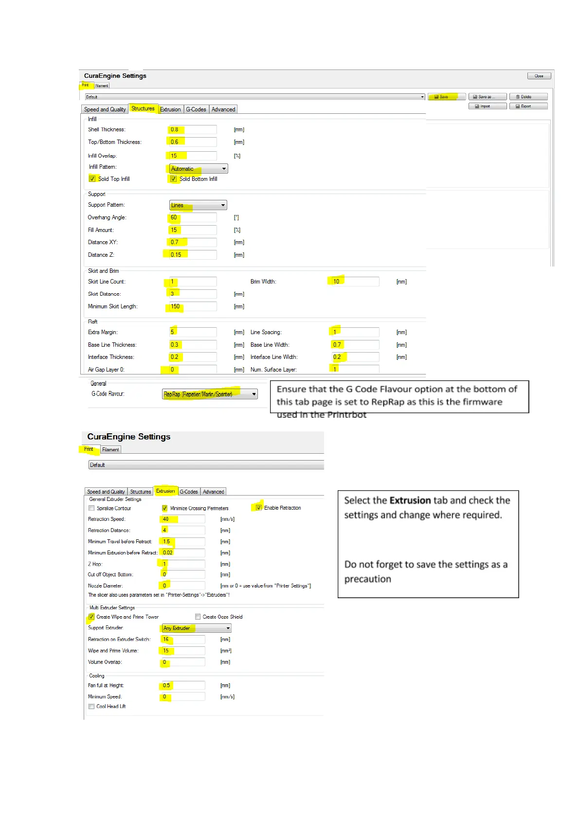 Printrbot Simple - CuraEngine Slicer Detailed Settings; Configure Print and Infill Settings; Configure Extrusion Parameters