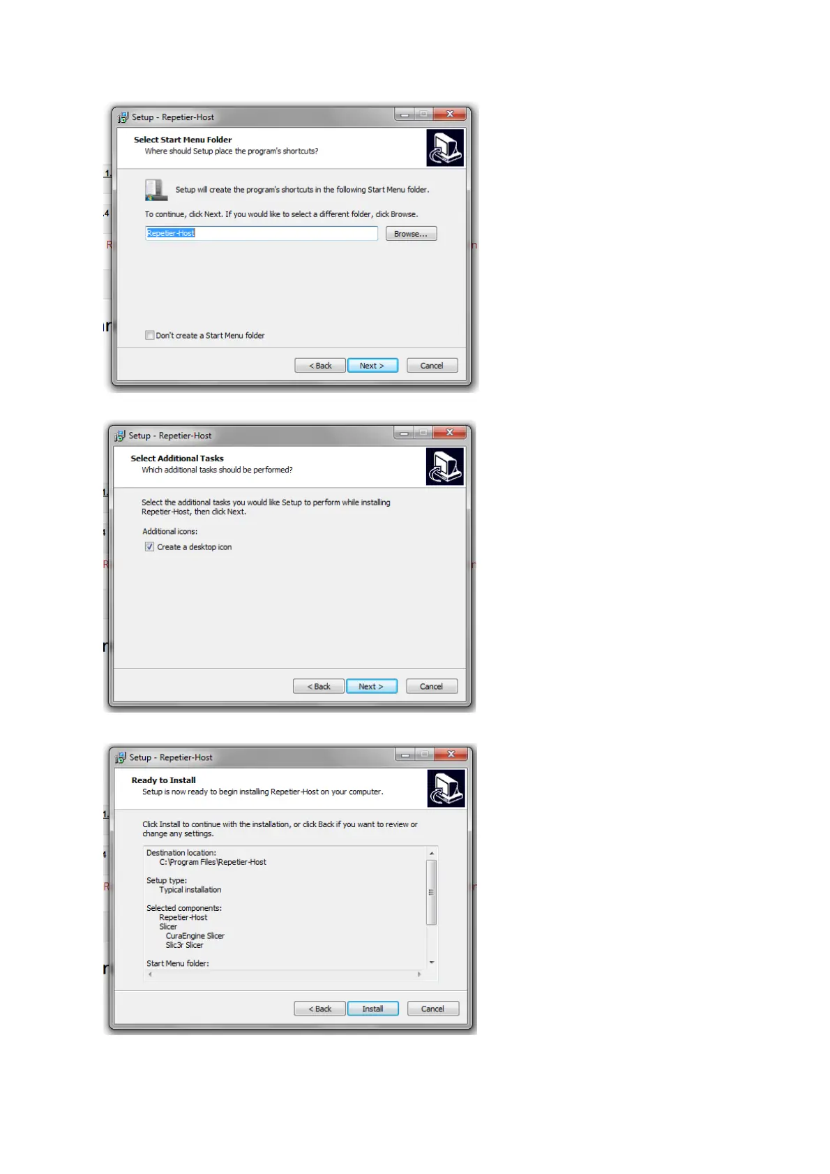 Printrbot Simple - Repetier Host Installation Steps; Configure Start Menu Shortcuts; Initiate Repetier Host Installation