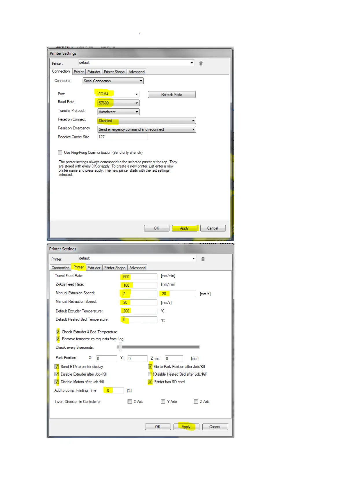 Printrbot Simple - Printer Configuration in Repetier; Set Connection Parameters; Configure Printer Movement Settings
